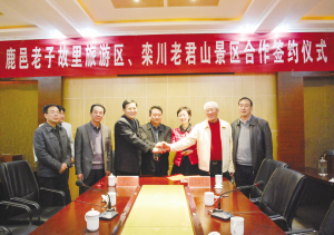 3月18日,鹿邑县老子文化宣传推介团在栾川老君山景区举行老子文化交流和旅游宣传推介活动,老子故里旅游区与老君山景区签订了老子文化景区联盟合作协议,以实现资源共享、合作共赢。(陈兴有 蒋保庆 摄)