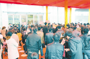 3月17日上午,春雨绵绵,气温较低,但春雨和低温阻挡不了市民购房置业的脚步。一大早,位于七一路与大庆路交汇处的腾龙名都售楼部门前新搭建的临时开盘庆典大棚里就站满了看房选房的客户,大家或围着沙盘评价着房型,或三五成群聚在一起讨论着该项目的优点和品质,气氛热烈,场面火爆。“今天到场的客户确实不少,开盘肯定不错,今年真的‘楼抬头’了。”几个前来观摩的房地产企业同行由衷地说。上午9时,腾龙名都正式开盘,在工作人员的组织下,叫号、选房、签合同、交款……一拨人怀揣着希望进去,一拨人面露着喜悦出来,开盘选房始终在有条不紊地进行着。截至上午11时,选房活动结束,销控表几乎贴满了“已售”告示,103套房源销售77套,小户型基本售罄,东西大户型的高层略有剩余。“今天的销售情况比我们预计的要好,这说明大家对腾龙名都是认可的,也说明周口的购房者很理性,特别重视性价比。”项目负责人朱总高兴地介绍。