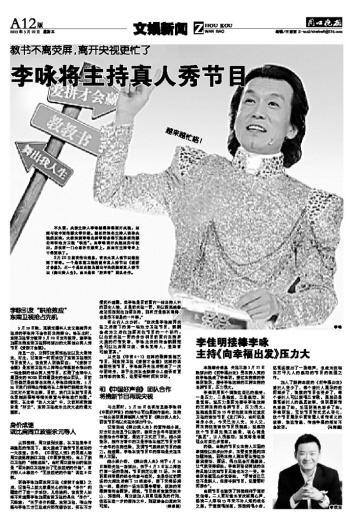 本报综合消息 央视三套3月21日晚播出的《向幸福出发》男主持人真的由李咏换成了李佳明。接过主持棒的李佳明表示,接手李咏这样的王牌主持的名牌节目,压力很大。