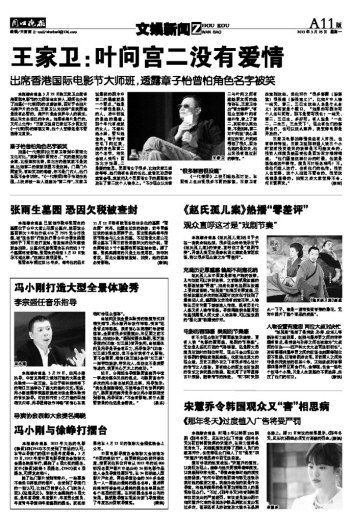 本报综合消息 3月22日晚王家卫出席香港国际电影节的大师班当主讲人,期间他分享了拍摄《一代宗师》的点滴故事,而对于合拍片与港产片的分歧,王家卫认为这种“自我围城是没有必要的,港产片是全世界华人的娱乐,却从未失去自己的本色。如果香港片是行的,又何止北传?”王家卫说自己看过不少网友对《一代宗师》的解读文章,他个人觉得还是不要想得太复杂。