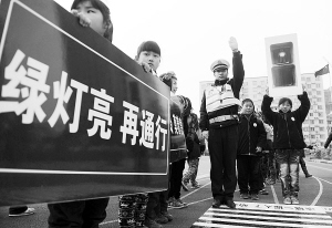 3月25日,合肥市交警支队蜀山大队警官马强强教孩子们认识交通指挥手势。