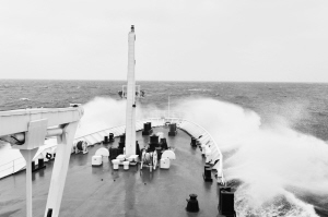 顶着一望无际的滔滔巨浪,中国渔政206船一直坚守在钓鱼岛海域。作为我国目前吨位最大、性能最先进的大型渔政船之一,中国渔政206船前身是“李四光”号测量船。由于测量船的特殊要求,船身平衡性能特别好。记者明显感到,与一般的船舶相比,中国渔政206船在九级风浪中的摇晃程度要小得多。
