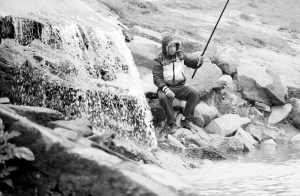 3月26日,一位市民在涨水的赣江南昌段岸边垂钓。