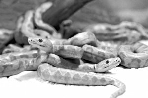 3月27日上午,记者在北京动物园两栖爬行馆看到,后台的繁育室只有三四平方米,室内四周摆满了孵化品和保育箱。在最大的一个保育箱内,趴着11条小蟒蛇。看到有生人进屋,它们都昂起头,张开了大嘴,吐着粉红的信子。