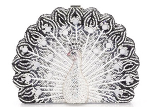 Judith Leiber的孔雀开屏手工手包由黑白色细水晶镶嵌,黑白色调的奥地利磨砂水晶镶嵌,顶部下推按扣,包链可隐藏于内袋。