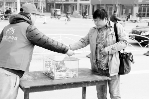本报讯 3月30日、31日,郸城县爱心捐助群在该县世纪广场再次为尿毒症患者张涛举行义捐活动,市民刘庆山为张涛捐款3000元(如图),成为个人捐资最多的爱心人士。