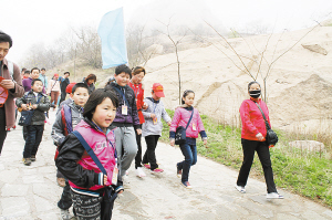 登嵖岈山对于善于思考的小记者们可是一项大强度的挑战,大家登一会儿总是询问导游小姑娘还有多远,小姑娘的回答总是:快了,快了,马上就到了。他们爬20分钟、30分钟、1个小时依旧是这个答案:快了,快了。于是大家也不再多问,铆足劲头往上爬吧!