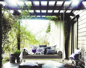 借鉴:露台可以称作超大号阳台,这个繁盛绿意的小花园,也是呼吸自然空气的后花园,合适舒适的室外家具,是享受无限春光的硬件保证。布艺软饰+木质家具,既保证家具本身不会破坏春意氛围,也能为主人带来柔软享受。吊床、秋千椅、长椅、藤质躺椅,都是不错选择。