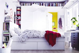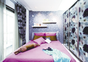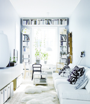 爱书的朋友可以将墙面与顶部充分利用,在墙面的最上面一层,围绕一面墙加上隔板。这样既不会影响房间的整体层高,给人以压抑感,又能够将家里日益增多的书籍找到合适的位置。另外,这一小设计还为原本单一、呆板的吊顶增加了一丝活力。如果房间的面积比较大,就不适合围绕一面墙安放隔板,可以选择利用单面墙或者落地门来设计收纳柜。(计安丽)