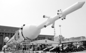 这是在河北省博物馆前展出的长征2F运载火箭1:1仿真模型(4月1日摄)。