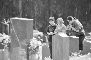 3月31日,美国旧金山郊外宁阳华人墓园内,一个华裔家庭拜祭先人。