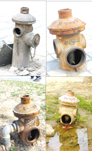 近日,记者在周口市区中州大道与汉阳路之间的滨河公园里看到,有七八处消火栓受损严重,上图是其中的4个。不少市民质疑“这样的消火栓在关键时刻还能不能用”。晚报记者 张擘 金月全 摄
