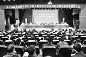 4月3日上午,周口职业技术学院召开了周口市支持周口职业技术学院加快发展座谈会暨联合办学签约仪式,院长张卫宪代表学院与河南水利水电学校、周口女子职业中专等5所学校签署了联合办学协议。(邱洋 黄健 摄)