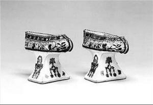 满族“高底鞋”的跟的形状有两种:一种是鞋跟上敞下敛,呈倒梯形花盆状,称为“花盆底”;另一种是鞋跟上细下宽、前平后圆,其外形和落地的印痕像马蹄印,所以称为“马蹄底”。
