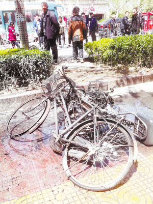 昨天中午,周口市区七一路周口七中门口,一辆自行车和一辆摩托车被烧成空架。据目击者介绍,可能是被风刮倒的自行车砸倒了摩托车,引起摩托车自燃。