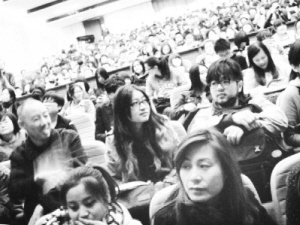 随后的讲座,不光过道站满了人,就连主席台前的红地毯上,都是席地而坐的青年学生。陈丹青面对满满当当的人群发问:今天江浦来了多少人?台下有人应声:五、六十人。陈丹青显然有些动容,他用江浦话念出自己插队的村庄名字,说自己在江西赣南和南京江浦都插过队,但特别不敢回江浦,“因为每次去,都会非常动感情”。