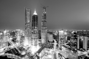 4月10日拍摄的上海陆家嘴,右侧建设中的超高层建筑为上海中心大厦。