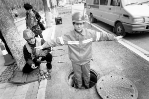 4月11日,沈阳水务集团排水管理处工作人员在演示窨井防坠网的保护功能。