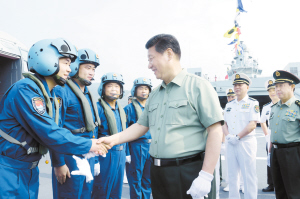 中共中央总书记、国家主席、中央军委主席习近平在出席博鳌亚洲论坛2013年年会相关活动后,专程来到海军驻三亚部队,代表党中央、中央军委向官兵们致以诚挚的问候,勉励大家深入抓好党的十八大精神学习贯彻,牢记党在新形势下的强军目标,坚定强军信心,献身强军实践。这是4月9日,习近平在井冈山舰上与舰载直升机飞行员亲切握手。