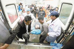 | 4月22日,医疗救护人员在转运芦山县双石镇西川村村民胥敏前往市区医院。胥敏于当日凌晨被余震砸伤。