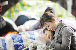 | 4月21日晚,在雅安市实验小学临时安置点的帐篷里,一位母亲给孩子讲故事。