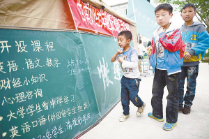 当日,来自西南财经大学的17名大学生志愿者在四川省芦山中学搭建起帐篷和课桌椅,为中小学生辅导功课。目前,芦山地震灾区的学校尚未复课。