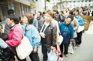 | 4月22日,在芦山县一处救灾物资发放点,群众排队领取物资。