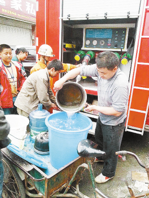 4月20日四川省雅安市芦山县7.0级地震发生后,芦山县城群众用水困难,四川省南充市消防支队官兵在积极营救被困群众的同时,利用消防车为灾区群众送去了生活用水,帮助他们渡过难关。