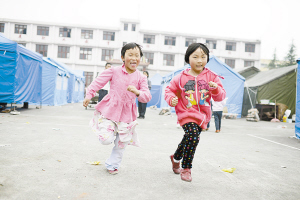 | 4月22日,小朋友在芦山县的一处安置点玩耍。