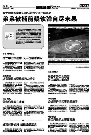 美国波士顿马拉松赛爆炸案“一号”嫌疑人塔梅尔兰·察尔纳耶夫4月18日晚逃亡途中与警方交火伤重不治。“二号”嫌疑人焦哈尔·察尔纳耶夫伤势严重,正在救治。马萨诸塞州州长德瓦尔·帕特里克告诉记者,焦哈尔还无法说话。按消息人士说法,焦哈尔喉部中弹,舌头受伤。伤口或因他企图饮弹自尽所致。美国媒体披露出大量细节,试图还原这两名嫌疑人的性格特质和蜕变之路。