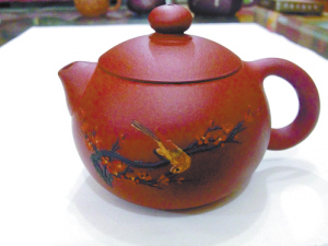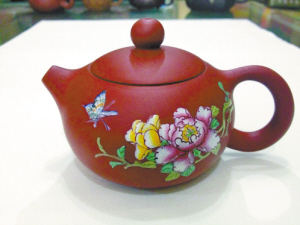一把装饰着牡丹图案的壶吸引了记者的目光。“这是点彩工艺,从景德镇瓷胎装饰上引用过来的,在壶坯上用彩釉堆画出图案,一般是花鸟类,然后低温二次烧制而成。”王志中说。