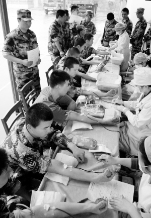 4月23日,在成都凤凰山机场,成都军区空军某场站74名参与救援保障的官兵,自发为芦山地震灾区义务献血,共献血21800毫升。这些官兵主要担负陆航救援直升机的后勤保障工作。新华社发