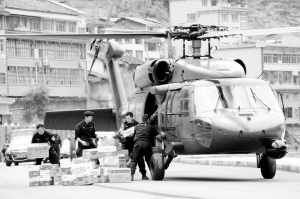 成都军区在芦山县城设立了直升机转运站,24日计划大规模出动13集团军某陆航旅直升机,将囤积在县城的各种救援物资,包括食品、帐篷、被褥等生活用品,空运至道路难以通行的重灾村镇。
