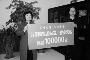 4月22日,全国人大代表、河南万果园集团公司总裁黄玉清得知四川雅安发生7.0级强烈地震后,立即组织公司相关部门,积极筹备10万元现金,来到市红十字会进行捐助,这一善举受到市领导高度赞誉。河南万果园集团是我市目前捐款数额最大的一家企业。