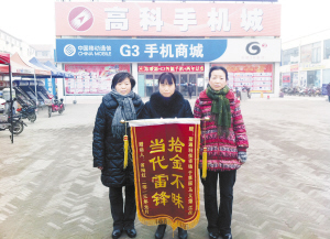 于草丽、马义荣、江侠三名女清洁工均是川汇区居民。1月14日10时左右,周口市区中州大道聚通科技市场门前,三名清洁工于草丽、马义荣、江侠像往常一样打扫着卫生。当她们打扫至市场南门时,发现地上有一个黑色提包,打开后发现,里面装有3500多元、购物券近4000元、银行卡、身份证以及一些货单等。每人每月的工资只有900多元的三个清洁工商量后决定:咱们丢了东西都很着急,别人丢了东西同样也会着急,咱赶紧找到失主。三人将提包交给了市场相关负责人,而后依据提包里身份证上的信息,通过七一路派出所联系到商水县胡吉乡派出所,最终辗转找到了失主省梅红。丢失的钱物失而复得,省梅红激动万分,她特意制作了一面锦旗送给于草丽、马义荣、江侠三人,锦旗上写有:“拾金不昧 当代雷锋”。