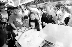 5月1日,游客在杭州清河坊历史街区观看糖画制作。