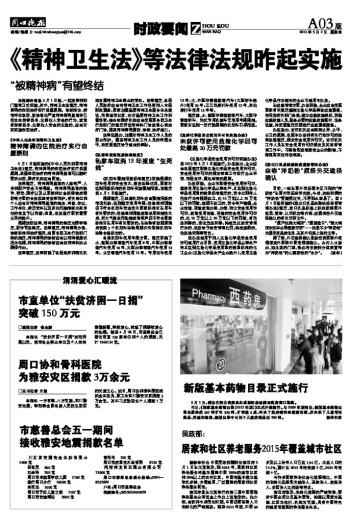 《精神卫生法》等法律法规昨起实施