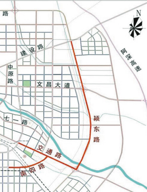 颍东路规划为城市主干道,设计速度为60公里/小时,红线宽度为50米,两侧各预留25米绿化带;南四路、交通大道(部分)规划为城市主干路,设计速度为50公里/小时,红线宽度为50米。全线桥梁共两座,均在颍东路上,分别是跨沙颍河桥和跨流沙河桥。