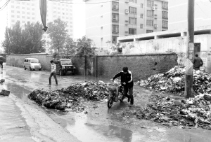 记者在建材路上的一个三叉路口看到,一个垃圾堆堵在路中间,垃圾堆旁有一个公厕。垃圾堆散发着刺鼻难闻的臭味,从此路过的市民只能在垃圾堆中穿行(如图),而汽车则不能通行。附近有几户居民的大门正好对着垃圾堆,苍蝇在居民大门口到处乱飞。