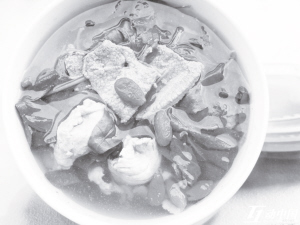 中医认为,黄豆能补肝养肾、滋润强壮;猪瘦肉能补虚增髓、滋阴润燥,两者为汤已是营养价值甚高且又性味平和,而薄荷能疏风散热、辟秽解毒。烹制此汤时步骤方法是关键,黄豆要多且充分浸透,猪瘦肉不宜多且剁烂,薄荷要新鲜且后下。