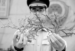5月12日,福建省宁德市公安边防支队侦查民警展示查获的红珊瑚。