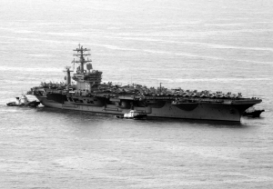“尼米兹”号航母排水量为9.7万吨,是世界最大型战船之一,所属战斗群包括“莫姆森”号和“普雷布尔”号导弹驱逐舰以及“普林斯顿”号导弹巡洋舰,共有64架飞机。