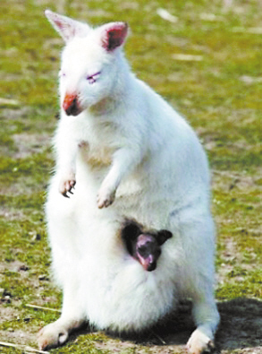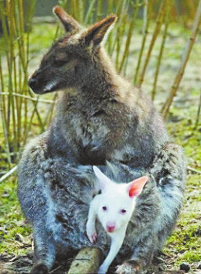 在英国艾塞克斯郡的一家动物园,一只毛色正常的袋鼠妈妈生下了一只白化袋鼠宝宝,而另一只白化袋鼠妈妈却生下了一只毛色正常的宝宝。动物园方面表示,这一现象非常罕见。他们还称,经常有来参观的游客问:“你们确定这两只袋鼠没抱错孩子吗?”