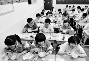 5月13日晚,江西九江市第一中学高三年级的高考住校生在享用爱心夜宵。