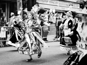 第七届纽约舞蹈大游行当天在曼哈顿举行,200多个舞蹈团体在细雨中展示了约80种来自各种文化的不同风格的舞蹈。新华社记者 牛晓雷 摄