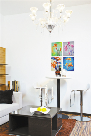 客厅的吧台如果不加装饰,会显得非常突兀。因此小吧台的装饰也很有讲究,台面已经不宽,再多放摆件占用位置实在不可取,不如在墙上做做文章吧,几幅多彩的壁画,韵味值瞬间提升。
