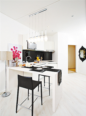 借鉴:与一天的其他用餐时间相比,早餐的时间显得更加宝贵而短暂,但是早餐又无疑是非常重要的,即使是极简风格的家装也必须为早餐用心设计一个空间。紧跟着厨房的吧台,实在是再合适不过了,黑与白的椅子和台面,餐布和餐具,又再一次增添了这种清新之感。要让一天都有好心情,早餐的环境也非常重要,吧台上的摆件也显示出主人的匠心独运。陶瓷的天使显得高雅又寓意吉祥,颜色单一为宜,玫红的油画作为主色,与之搭配的便均为白色,即使头顶排列的吊灯也是纯白的。