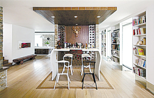 品酒之喜好不是人人都能有,故而专门用于品酒的吧台也必然会有独特的设计,墙面的四周设计成酒架,为吧台节约了空间。同时在体现主人有丰富的藏酒外,也区别于酒吧里的吧柜。