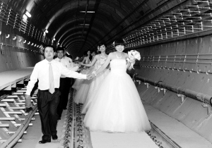 5月20日,11对新人在郑州地铁一号线东风南路站的隧道工地上合影。