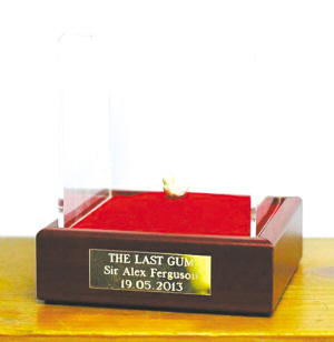 据这名神秘卖家透露,他是在西布罗姆维奇主场——山楂球场找到这颗口香糖的,之后他为口香糖特制了一个玻璃盒,下方还嵌了一块铭牌,刻上了“弗格森爵士最后的一块口香糖,2013年5月19日”字样。
